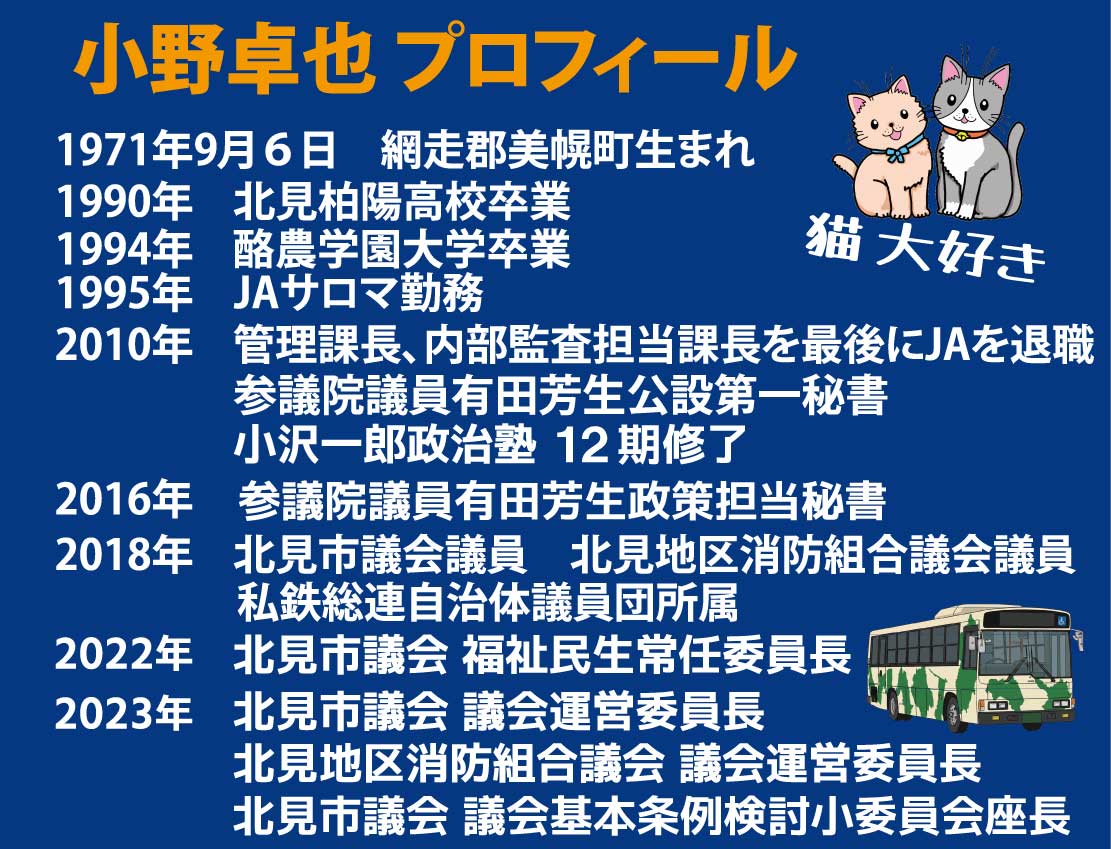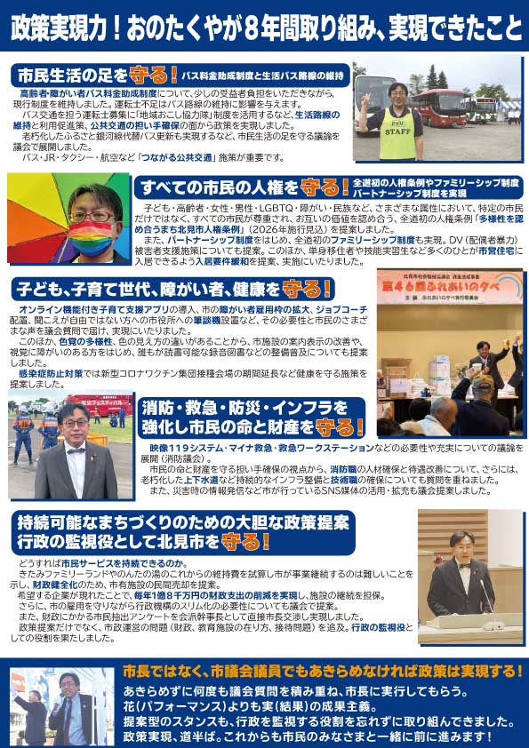 おのたくや後援会・市政事務所〒090-0065北見市寿町2丁目1-22(消防本部横)TEL 0157-57-5835